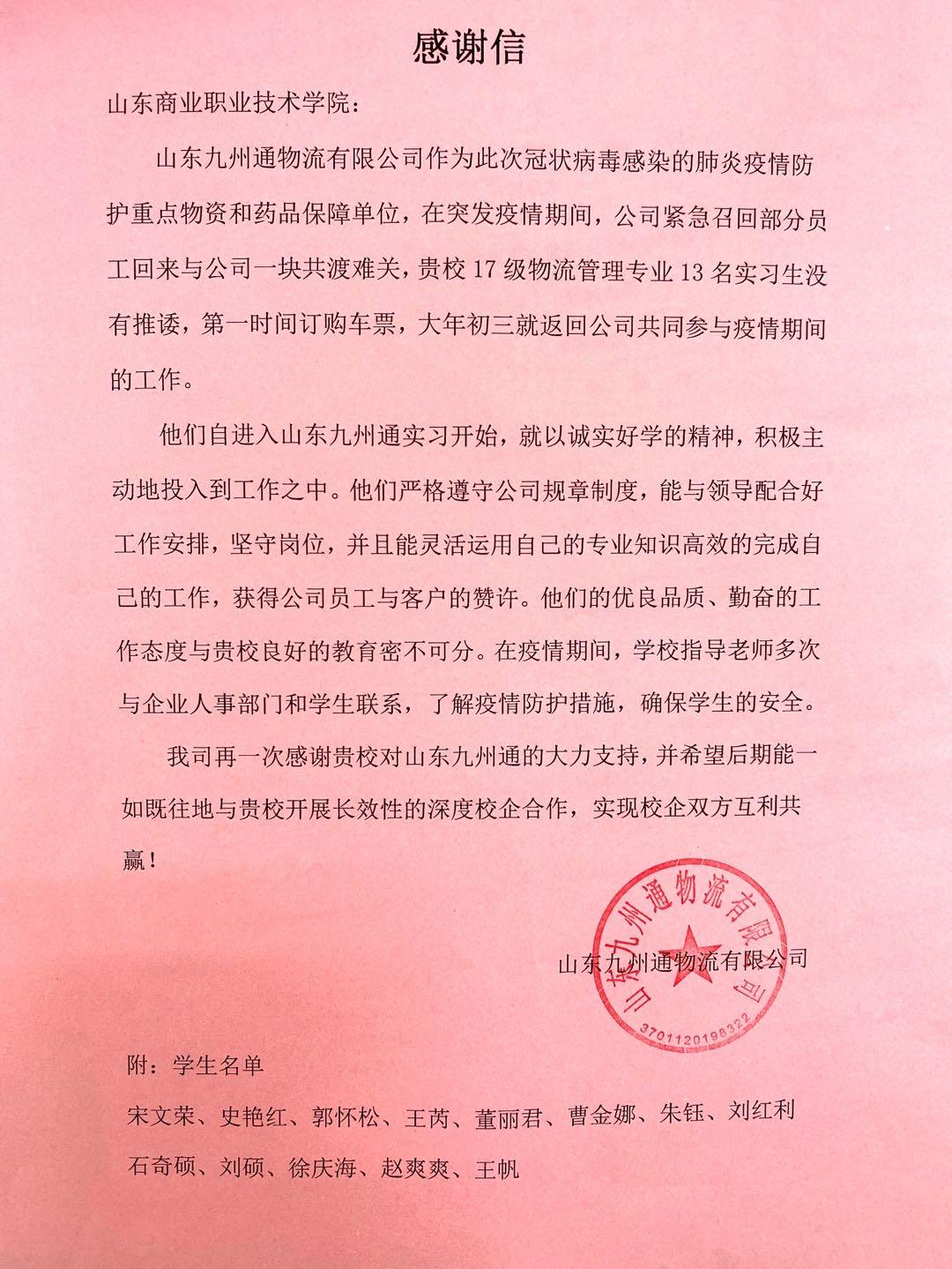 近日,山東商院智能制造與服務學院收到山東九州通物流有限公司的感謝信,信中對學院13名實習生在公司運輸防護重點物資和藥品保障工作中的堅守和努力表示感謝。
