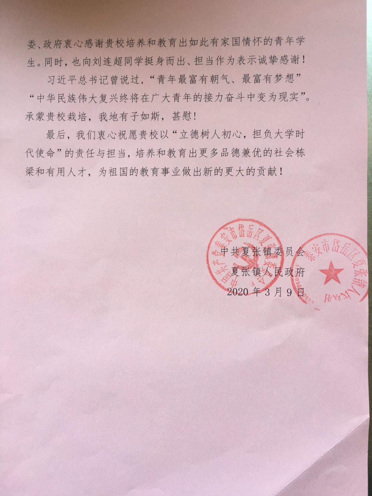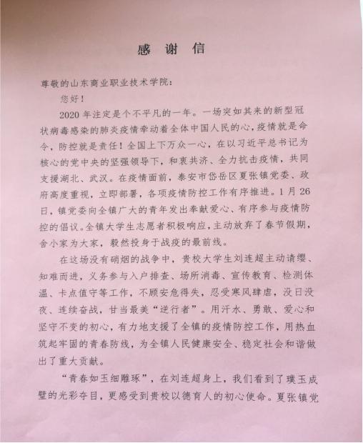 近日,山東商院收到了一封來自泰安市岱岳區(qū)夏張鎮(zhèn)的感謝信,信中對學(xué)院劉連超同學(xué)在當(dāng)?shù)匾咔榉揽毓ぷ髦械母冻雠c貢獻表示感謝。