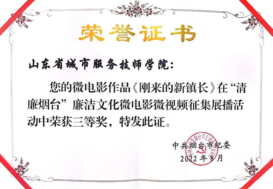 近日,由省城市學院出品的“慶七一·喜迎二十大”當代題材微電影《剛來的新鎮長》榮獲“清廉煙臺”廉潔文化微電影微視頻征集展播活動三等獎。