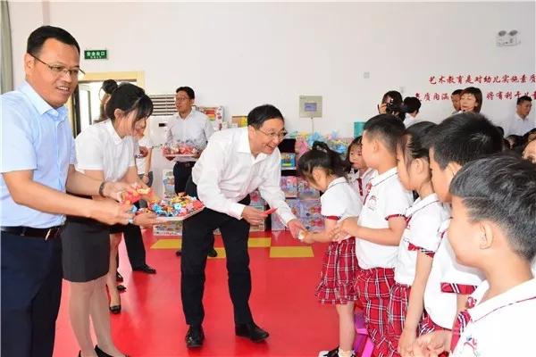 隨后,凌沛學一行將精心準備的兒童圖書、體育用品、玩具、糖果等節日禮物一一送到孩子們手中,與孩子們進行了親切互動,并再次祝孩子們節日快樂。凌沛學一行還走進教學一線現場調研,觀摩孩子們的戶外活動情況,并給出了建議與指導。