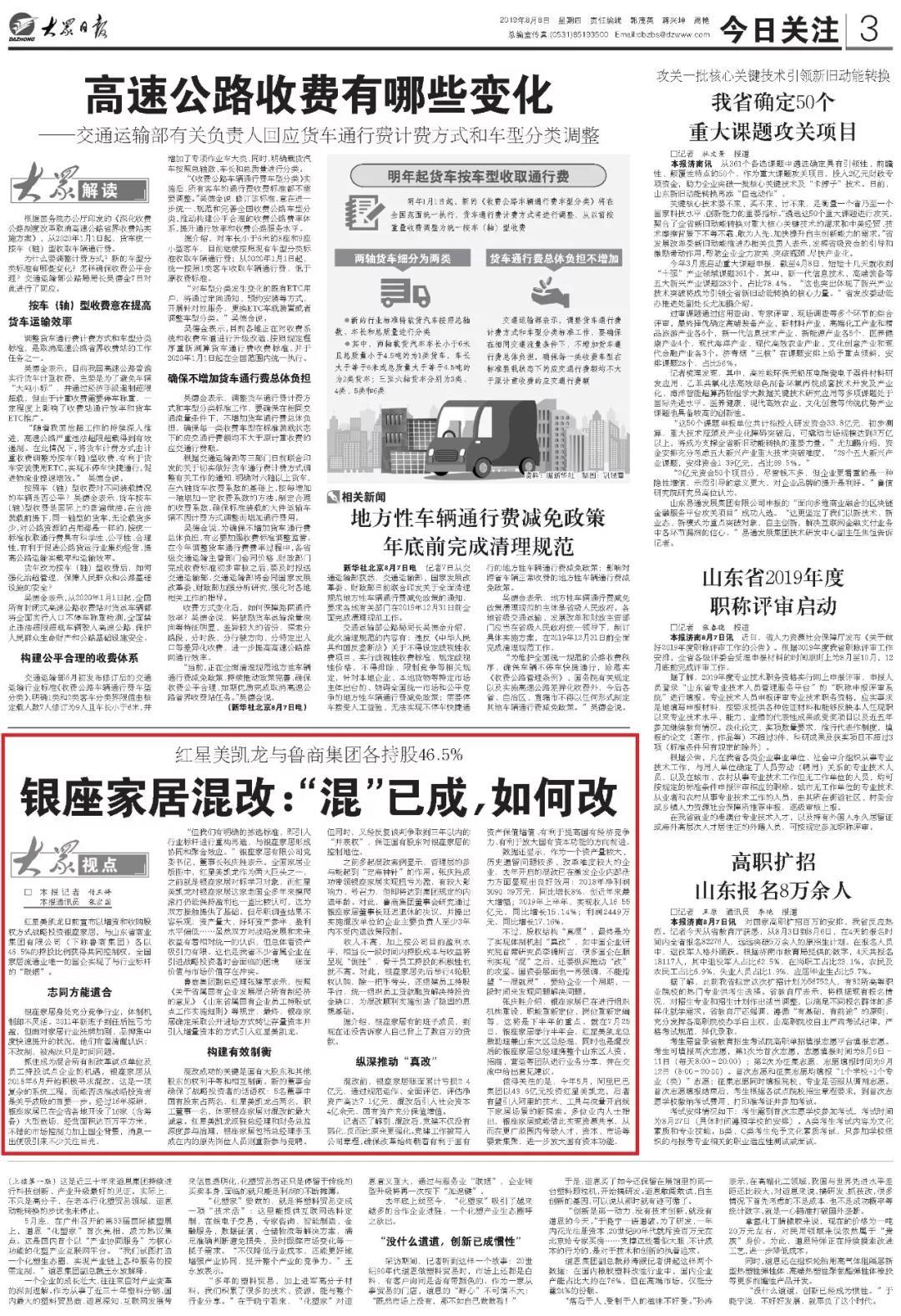 大眾日報刊發重點報道《銀座家居混改:“混”已成,如何改》