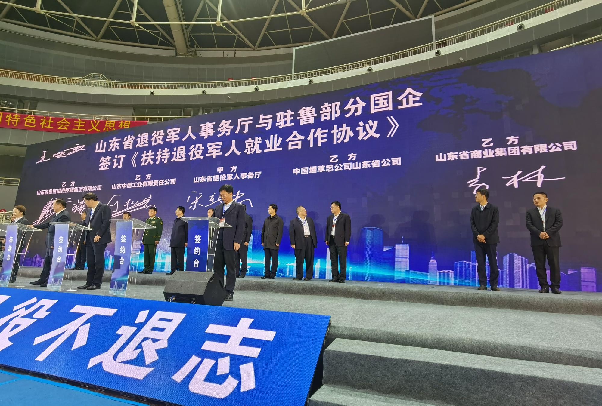 11月5日上午,省退役軍人“就業直通車”專場招聘會在濟南奧體中心東荷體育館舉行,副省長、省公安廳廳長范華平出席,省退役軍人事務廳廳長時培偉主持啟動儀式。現場,省退役軍人事務廳與省商業集團有限公司(以下簡稱魯商集團)等9家駐魯國企簽署了《扶持退役軍人就業合作協議》,魯商集團黨委常委、組織人力資源部部長李林代表集團簽約。