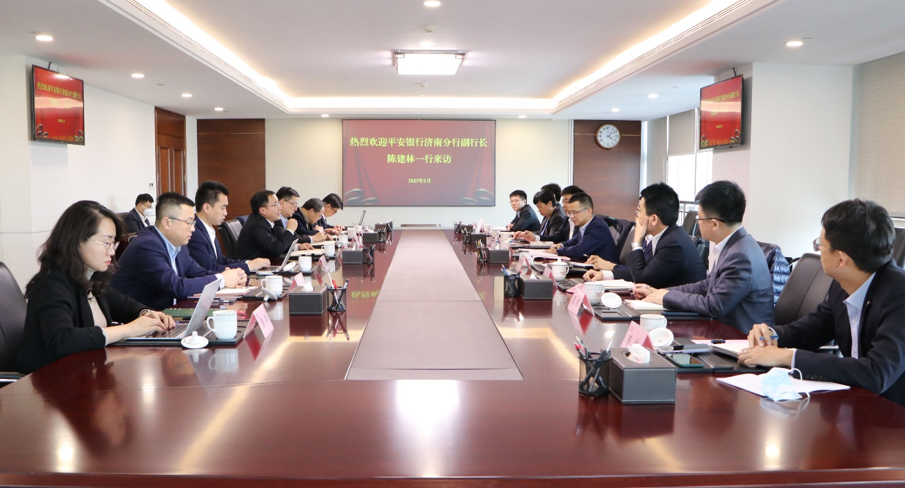 2月13日,平安銀行濟南分行副行長陳建林到訪魯商集團,集團黨委副書記、董事、副總經理朱華建熱情接待。