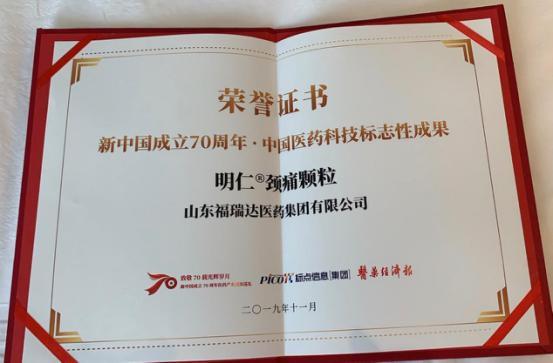 11月4日,“2019全國醫(yī)藥經(jīng)濟(jì)信息發(fā)布會(huì)暨米房會(huì)年會(huì)”在廣州開幕。在大會(huì)組織籌辦的“致敬70載光輝歲月——新中國成立70周年醫(yī)藥產(chǎn)業(yè)成果巡禮”活動(dòng)中,福瑞達(dá)醫(yī)藥集團(tuán)公司明星產(chǎn)品明仁頸痛顆粒榮登“中國醫(yī)藥科技標(biāo)志性成果”榜單。