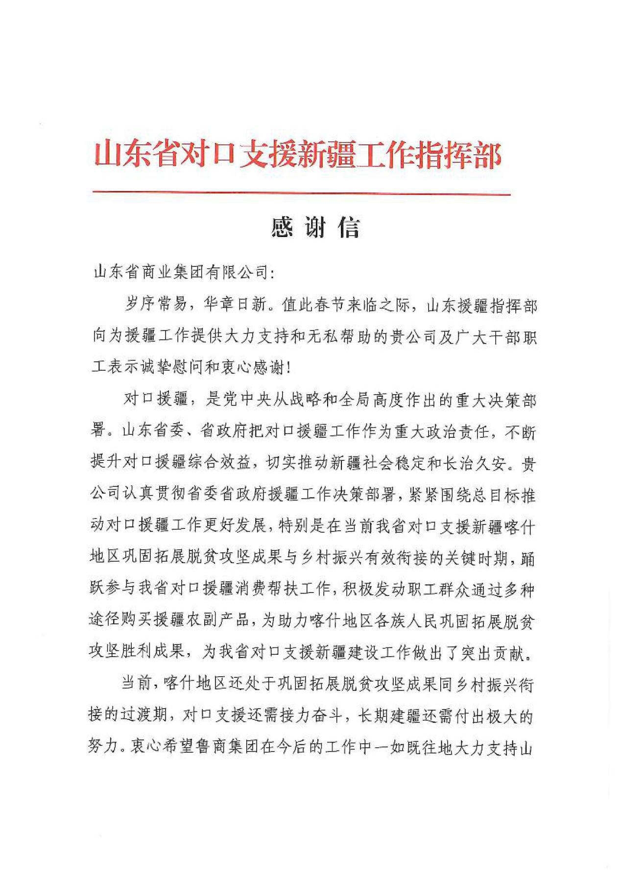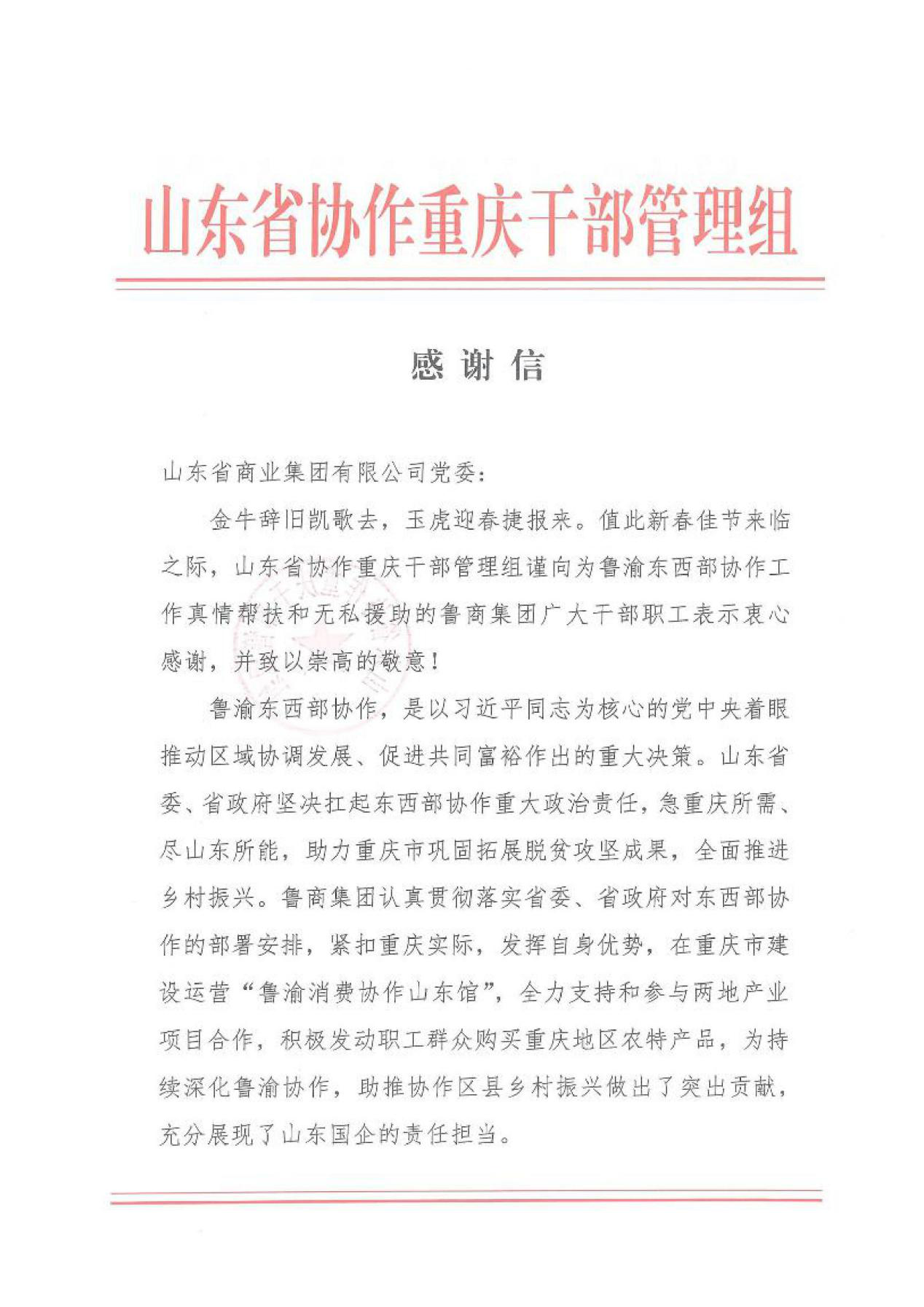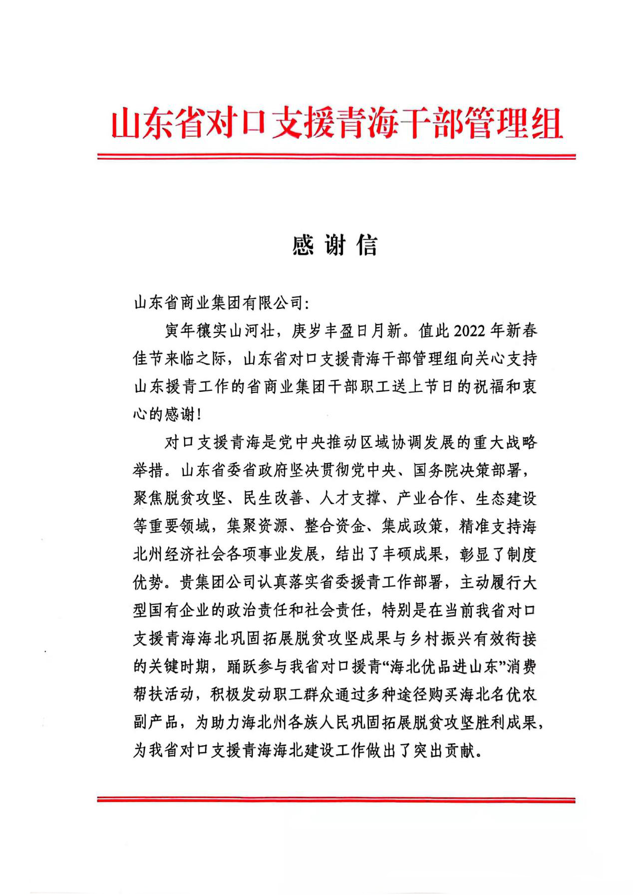 感謝信中表示,魯商集團認真貫徹省委、省政府對對口支援和東西部協作工作的部署安排,緊緊圍繞總目標推動支援協作工作更好發展,踴躍參與我省對口支援消費幫扶工作,主動履行政治責任和社會責任,積極發動職工群眾通過多種途徑購買幫扶地區農副產品,為助力西部地區人民鞏固拓展脫貧攻堅勝利成果,助推協作區縣鄉村振興,為我省對口支援西部地區建設工作作出突出貢獻。