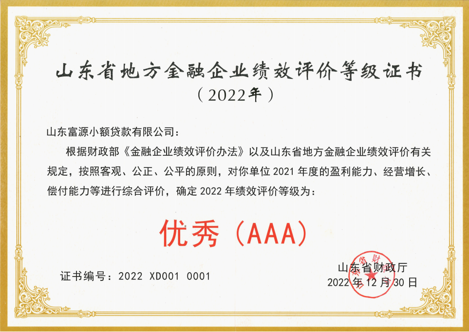 近日,富源小貸榮獲省財政廳頒發(fā)的2022年山東省地方金融企業(yè)績效評價“優(yōu)秀(AAA)”等級證書,這是公司連續(xù)4年獲此殊榮。