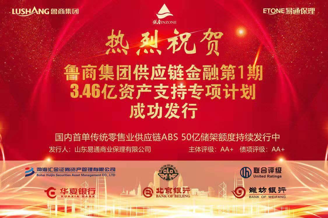 6月6日,省商業(yè)集團(tuán)有限公司(以下簡稱魯商集團(tuán))供應(yīng)鏈金融資產(chǎn)支持專項計劃第一期在上海交易所成功發(fā)行。本期發(fā)行規(guī)模3.46億元,債項評級AA+,產(chǎn)品期限一年。