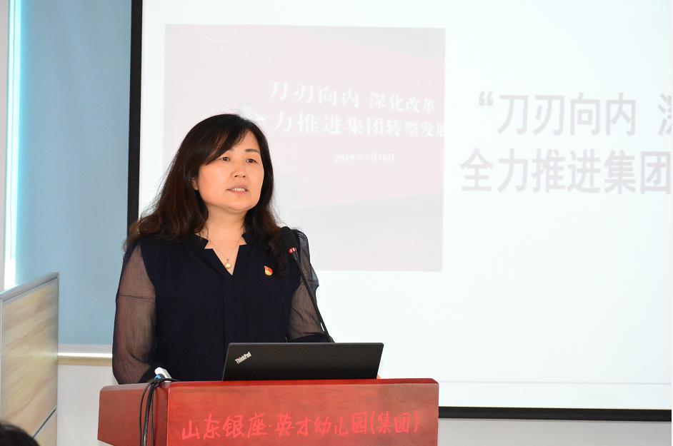 焦敏作了題為《品質聚能,改革創新,努力實現銀座幼教高質量、可持續發展》的報告。她指出,銀座幼教在2019年上半年取得的成績是大家攜手奮進的成果,但必須清醒地認識到,面臨著日益嚴峻的學前教育發展形勢,仍然存在著思想保守,危機感、緊迫感不強,新業務轉型拓展步伐緩慢,高層次人才能力匹配不均衡與園所管理風險加大等問題。她強調,只有堅持問題導向,刀刃向內,敢于動真格,始終保持不解決問題絕不松手的韌勁,才能開創事業發展的新局面。