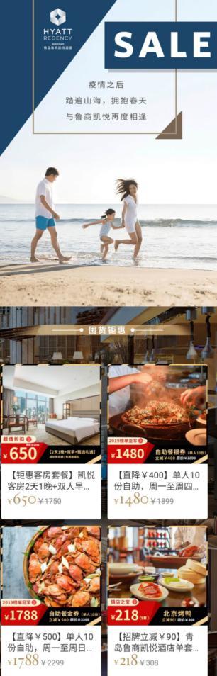 疫情期間,青島魯商凱悅酒店靈活應變,通過官方微信商城推出迎春預售活動彌補缺口。此次銷售幾乎涵蓋所有酒店熱銷產品,達到了預熱高端餐飲市場的效果,為后期的消費爆發打好基礎。 自2月28日晚8點上線到3月8日中午12點,酒店銷售額已經超過11萬元,預計帶來的婚宴銷售將達50萬元,目前線上銷售還在火爆進行中。在銷售產品的過程中,酒店潛心維護目標粉絲會員體系,通過粉絲群、會員活動等增強彼此的信任與依賴,增加目標客戶群體的粘性。同時,酒店積極嘗試婚宴和會議銷售“云簽約”,探索經營新模式、開拓新思路的創新實踐,也為酒店其他業務的發展提供了良好的范例。