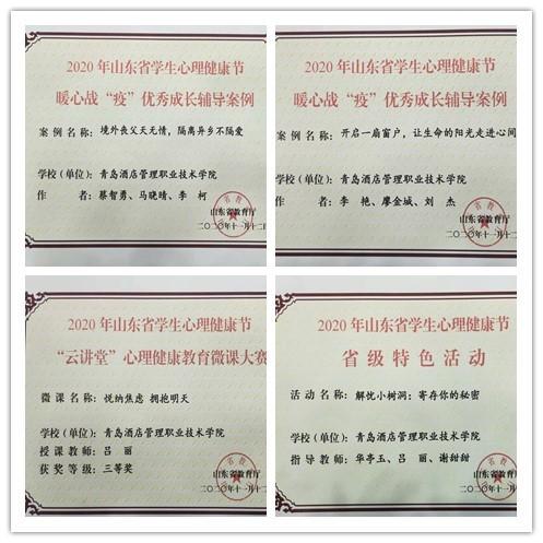 11月16日,山東省大學生心理健康教育專委會2020年年會對省大學生心理健康節獲獎項目進行了表彰,青島酒店學院選送的4項作品喜獲佳績。