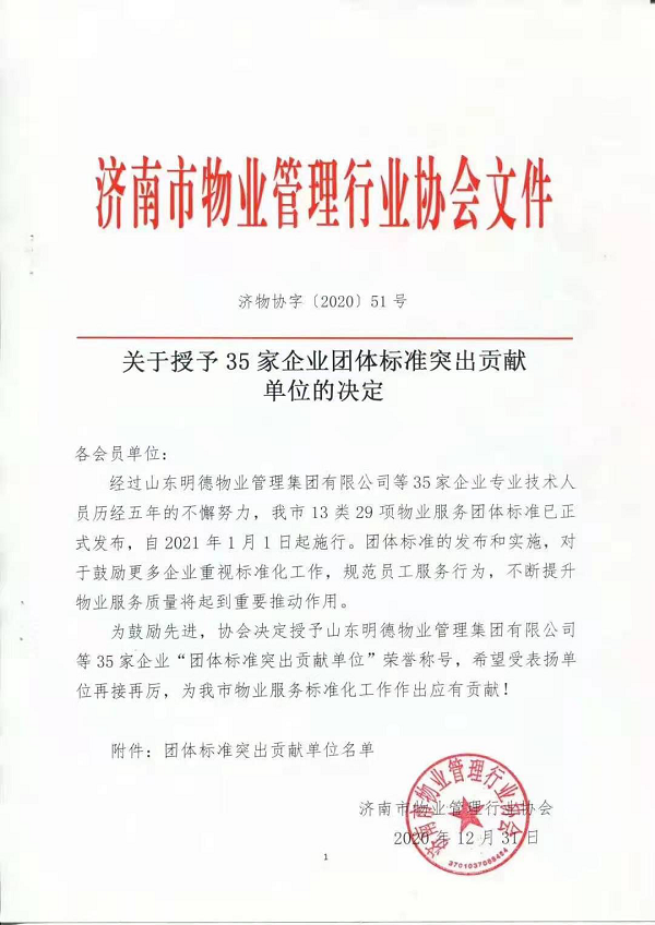 近日,濟南市物業管理行業協會發布了《關于授予35家企業團體標準突出貢獻單位的決定》,對魯商物業等參與制訂物業團體標準的單位進行了表彰。