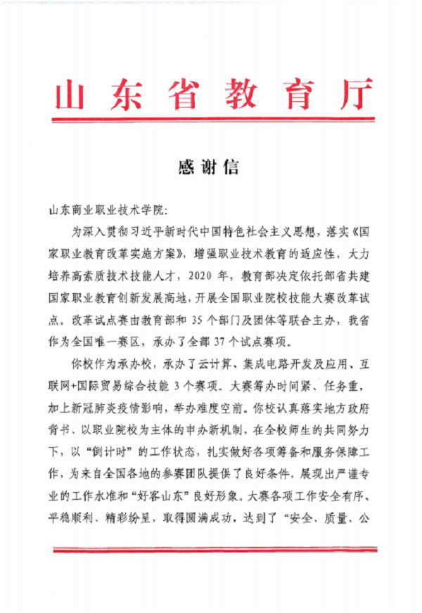 近日,省教育廳給山東商院發來感謝信,對學校在承辦全國職業院校技能大賽改革試點賽中作出的貢獻予以肯定,向學校及師生表示衷心的感謝。