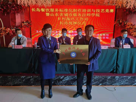 賀鴻授予長島餐飲與住宿行業(yè)協(xié)會“山東省城市服務(wù)技師學(xué)院‘鄉(xiāng)村振興工作站’”匾牌。
