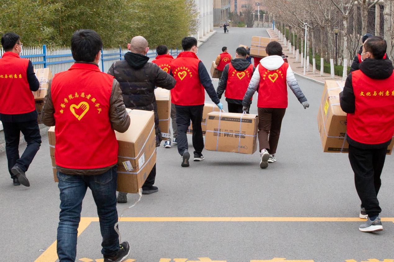 因貨運車輛無法進入,防疫物資運抵校園后如何運輸成了問題。學(xué)院黨委集中整合各部門黨員組成抗疫志愿者服務(wù)隊,趕赴現(xiàn)場進行搬運、整理、清點防疫物資等工作,近150箱應(yīng)急物資不到1小時便全部搬運完成。