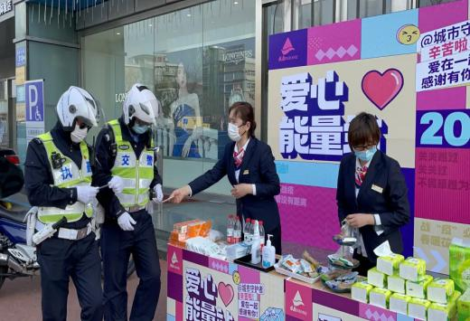 各門店在入口處組織開展“致敬逆行者、愛心能量站”志愿服務活動,為醫護人員、快遞員騎手、配送司機、交警民警、環衛工人、社區志愿者等城市守護者提供甜品、餅干、口罩、飲用水等補給物資,向為疫情防控默默奉獻的工作人員送去暖心服務。