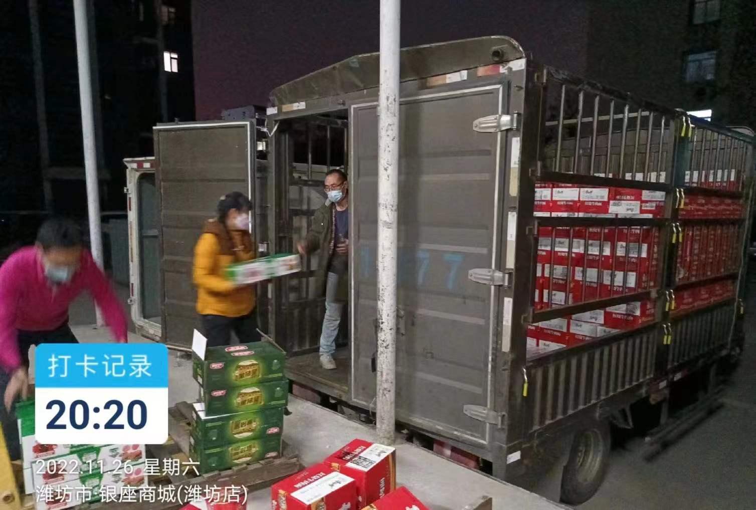 11月26日晚,銀座濰坊區域門店獲悉濰坊市高新區某重點企業有物資需求,第一時間與該企業取得聯系。此時距離閉店僅剩不到10分鐘,為保障物資及時送達,門店立即聯系配送中心濰坊倉聯動配合,協調車輛將緊急調撥的340箱桶裝方便面與4000多根火腿腸送達客戶指定地點,以“銀座速度高效解決顧客物資急需問題。