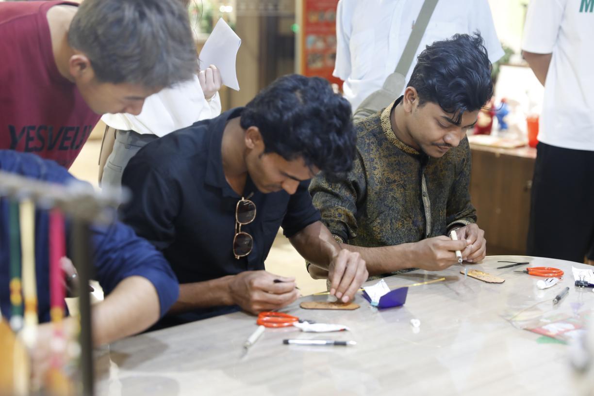 掐絲琺瑯是最具中國特色的傳統(tǒng)手工藝品之一,在老師的帶領(lǐng)下,外籍師生體驗(yàn)了涂膠、掐絲、調(diào)沙、固沙、風(fēng)干等環(huán)節(jié)。“這真的太精彩了,掐絲琺瑯給我?guī)砹朔浅S腥さ捏w驗(yàn)。”來自巴基斯坦的外籍教師阿潤激動(dòng)地說道。