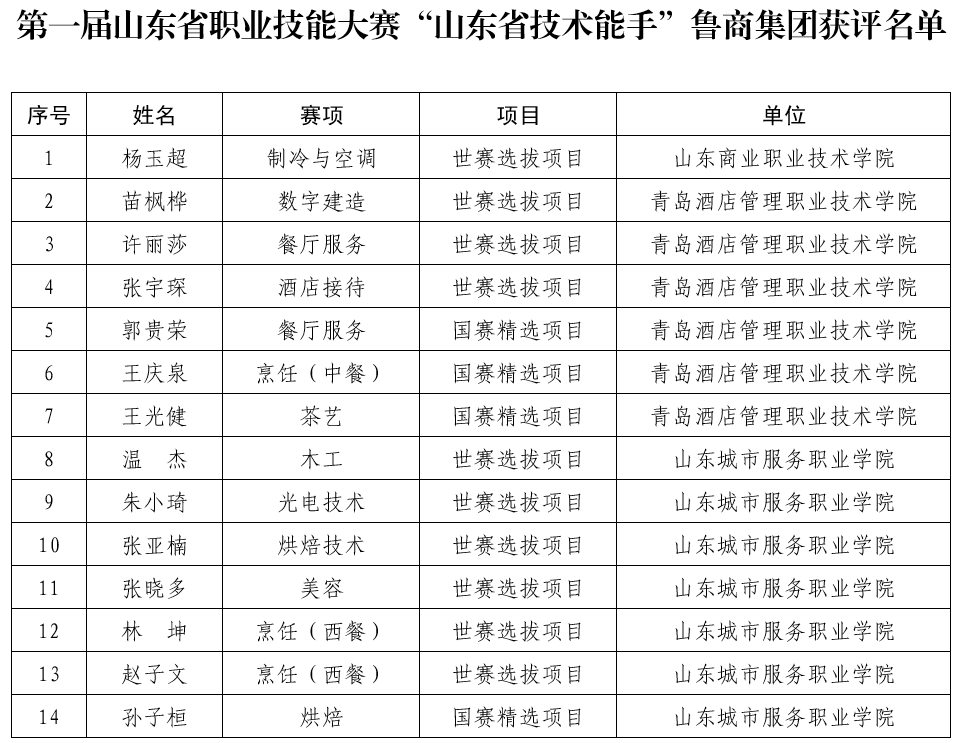 7月14日,省人社廳公布第一屆山東省職業技能大賽“山東省技術能手”名單,魯商集團3所院校共14名師生獲評,其中山東商職學院1人、青島酒店學院6人、山東城市學院7人。