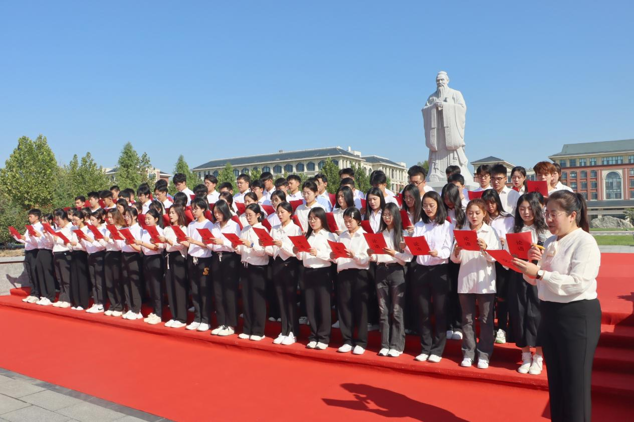 儀式上,呂傳毅與韓冰一同為孔子圣像揭幕。師生整理衣冠、莊嚴(yán)肅立,面向孔子圣像鞠躬行禮并誦讀《論語(yǔ)》經(jīng)典名句。