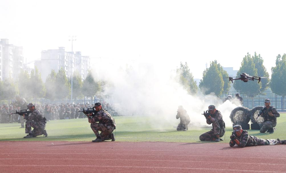 典禮在雄壯的國歌聲中開始。軍訓匯演環節依次展示了女子匕首操、應急棍術、刺殺操、綜合戰地救護等特色表演項目,并進行了分列式匯演,同學們精神抖擻地通過主席臺接受檢閱,展現出朝氣蓬勃的青春風貌。