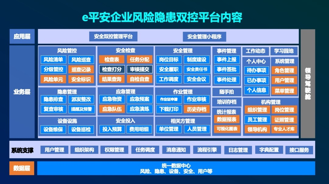 “e平安”企業風險隱患雙控管理項目充分應用互聯網、大數據分析等新技術,涵蓋新聞動態、工作通知、安全通報、安全知識、法律法規、智能安全設備監控等內容。利用移動辦公技術,通過便捷化流程指引、專業化數據支撐,實現企業日常安全高效自主管理,助力企業持續提升安全管理水平、全面提升安全管理工作效率,數字化展現安全生產管理成果,為企業的發展保駕護航。