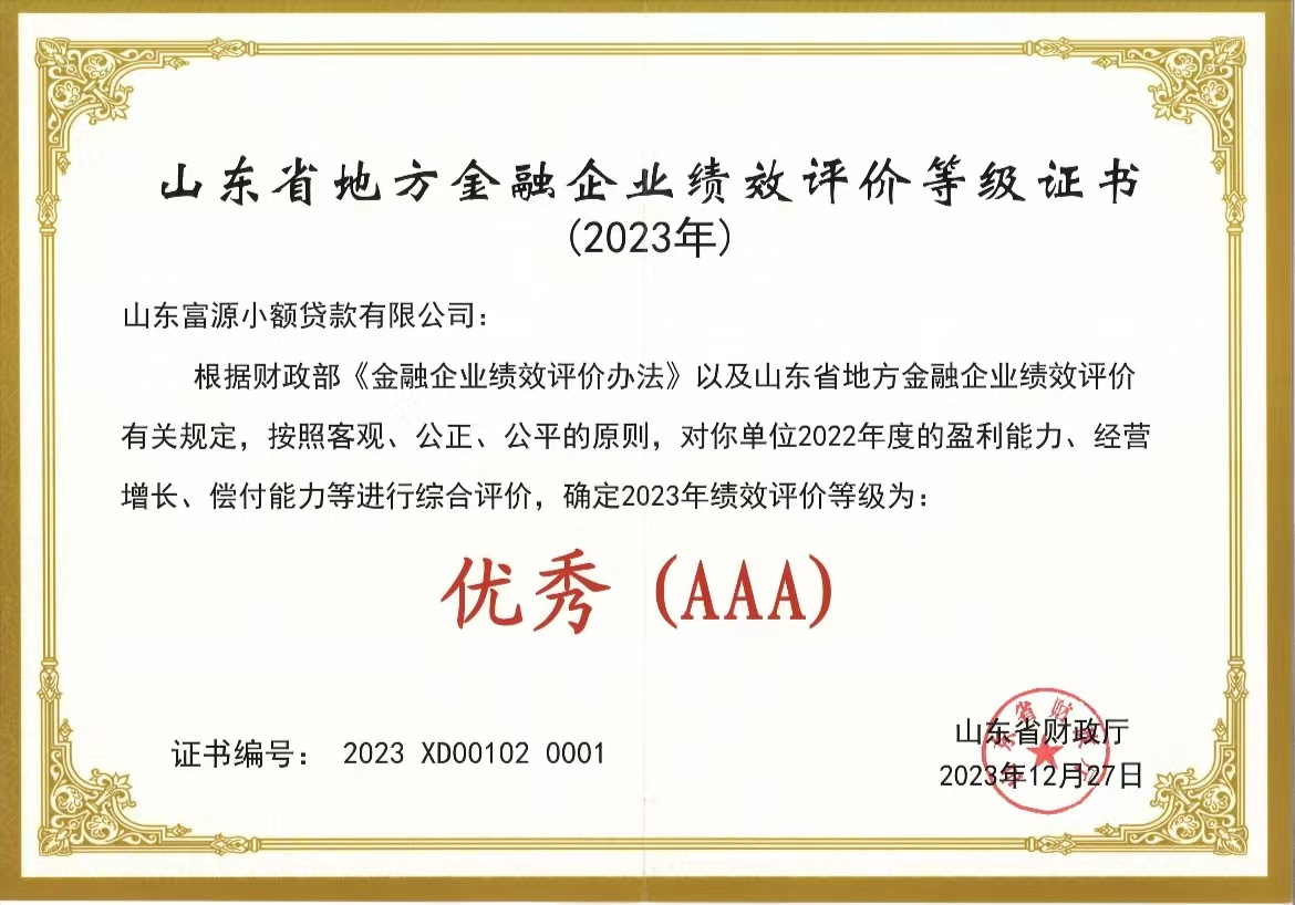 近日,富源小貸榮獲省財政廳頒發(fā)的2023年山東省地方金融企業(yè)績效評價“優(yōu)秀(AAA)”等級證書,這是公司連續(xù)5年獲此殊榮。