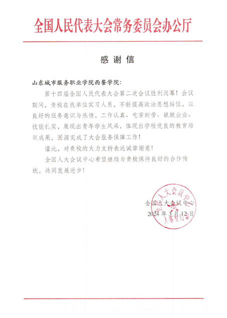 3月12日,全國人大會議中心給山東城市服務職院西餐學院發來感謝信,對學院服務十四屆全國人大二次會議的學生予以高度贊揚,對學院的大力支持表達誠摯謝意。