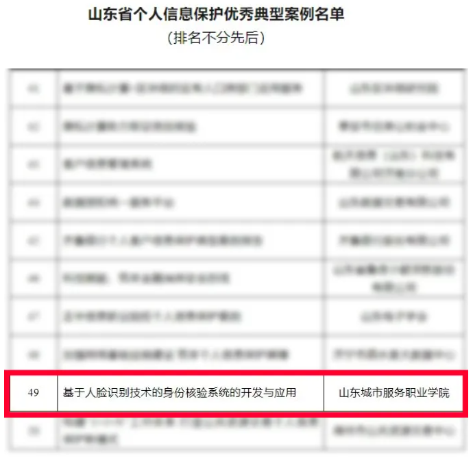 近日,山東省個人信息保護優秀典型案例名單公布,山東城市服務職院“基于人臉識別技術的身份核驗系統的開發與應用”案例成功入選。