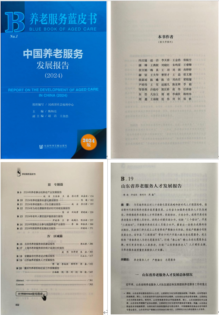 近日,由民政部社會福利中心組織編撰的《中國養(yǎng)老服務(wù)發(fā)展報告(2024)》藍皮書(以下簡稱《藍皮書》)正式發(fā)布,由社會科學文獻出版社出版,山東商職學院參與了起草工作。