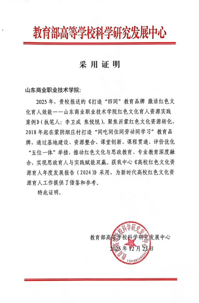 近日,山東商職學院報送的《打造“四同”教育品牌 激活紅色文化育人效能——山東商業職業技術學院紅色文化育人資源實踐案例》成功入選教育部高等學校科學研究發展中心《高校紅色文化資源育人年度發展報告(2024)》,為新時代高校紅色文化資源育人工作提供了借鑒和參考。
