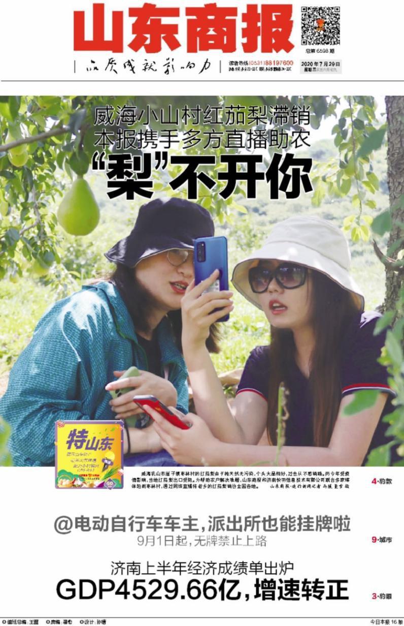 今年以來(lái),山東商報(bào)已經(jīng)累計(jì)推出了10多場(chǎng)“特山東”品牌活動(dòng),推介了包括平陰泉水櫻桃、商河仁鳳西瓜等品牌在內(nèi)的農(nóng)產(chǎn)品。7月28日至31日,頂著高溫酷暑,山東商報(bào)記者團(tuán)隊(duì)從濟(jì)南趕赴威海乳山崖子鎮(zhèn)棗林村、濰坊安丘市凌河鎮(zhèn)的百鵝疃村,在田間地頭做了兩場(chǎng)直播帶貨活動(dòng),為當(dāng)?shù)販N(xiāo)的特色農(nóng)產(chǎn)品紅茄梨、牛奶小芋頭和紅芽嫩姜找出路。本次活動(dòng)中,山東商報(bào)聯(lián)合多家媒體共同出擊,幫助當(dāng)?shù)剞r(nóng)民售出總計(jì)20萬(wàn)斤特色農(nóng)產(chǎn)品。