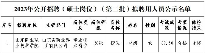 根據中共山東省委組織部、山東省人力資源和社會保障廳《關于印發2023年度省屬事業單位公開招聘工作實施方案的通知》(魯人社發〔2022〕23號)和省屬事業單位公開招聘有關政策規定,按照崗位招聘計劃,山東商業職業技術學院組織完成了2023年公開招聘(碩士崗位)(第二批)工作人員考試、體檢、考察等工作,現對該單位擬聘用人員進行公示。公示期為7個工作日,自2023年11月23日至2023年12月1日(不含節假日)。公示期間,如對公示人員有異議,請向山東省商業集團有限公司組織人力資源部反映。反映問題要實事求是,并告知真實姓名及聯系方式。